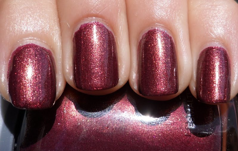 I don't really get the name of it. Like "rocket's red glare"? Either way, another gorgeous polish that I didn't expect to like at all. I thought it'd be a normal red shimmer but it turned out to be really lovely, understated and unexpected. It's a muted burgundy red that is shot through with warm gold shimmer. It's a very autumn-y color to me. A bit dull indoors but once the sunlight hits it, the gold really shines through and enlivens the red and gives it an orangey glow. Three coats.
