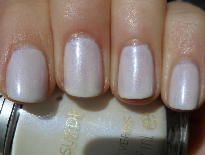 This was released sometime in late summer but I think it's a perfect winter polish: reminds me of snow! Soft, sheer white with a gorgeous blue shimmer. REALLY sheer. I think this is five coats... and it's still not opaque. Luckily, the formula applies nicely so five coats wasn't as painful as it sounds. This was part of Revlon's Suede line, which means it dries satiny rather than glossy.
